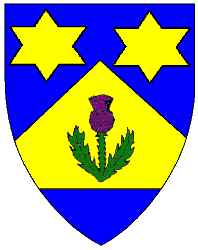 Lord Seamus' name and device (Per chevron azure and Or, two mullets of six points Or and a thistle vert headed purpure, a base azure) are registered with the SCA College of Arms.