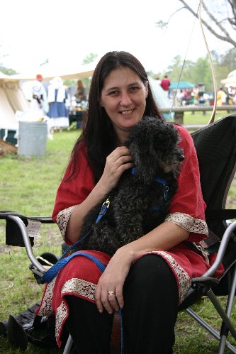 Shown here at Fool's War XVI in April of XXXIX (2005), Ailsun says that she is interested in autocratting, pavilion-making, archery, armoring, cooking -- she is a self-confessed "redneck greasecook" -- and a number of other activities. She has been in the SCA on and off since about A.S. XXXII (1997). She's been historian for the shire of Forth Castle, feastcratted Midnight in the Garden of Good and Medieval, and assists in the kitchen at nearly every event where she's allowed (she was priceless at last year's Champions' List). She also has run the kitchen at Fools' War in A.S. XXXV and A.S/ XXXVI that feeds staff and forlorn-looking beggars. She's a bit of a jack-of-all-trades in the A&S world, though she specifically shows an incredible talent for costuming and generally uses her skill to clothe newcomers (we can't count the number of times she's garbed college students out of pocket). She received the Forth Castle shire award, the Radiant Tower, for her services in the kitchen and for her sewing. Her ultimate goal is simply to learn more about feastcratting...as frequently as possible - it's an ongoing quest. She did the Low Country Boil (along with Sir Simon Macleod) for the elevation of Mistress Yseult, and she currently is working on her name and armory. Ailsun is also the proud mother of Codi and Gail.