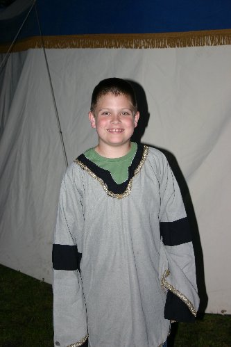 Codi (no SCA name yet) is the son of Ailsun McKeown, and we welcome him to our househild. Codi is a member of the Pages' School of Meridies, and focuses primarily on service. At the Southern Regional Fighter Practice in A.S. XXXVII (2002) he spent the entire day waterbearing, and received a scroll from the host group (Marion Glen) in court *and* a token from His Majesty Artan for his awesome works that day. He has decided since that he really enjoys helping the fighters, and wants to continue with that type of service. Codi, like his mother (Ailsun MacKeown), is also a cook, and has tried his hand at sewing. He's hoping next to learn more about armoring, woodwork, and leatherwork, and would like to try archery (w think we can handle all that!). Mundanely, he's in the third grade, and his primary hobbies are reading (mostly Harry Potter) and sports, especially baseball and soccer. This picture was taken at Fool's War XVI in April XXXIX (2005).