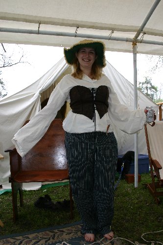 Jaida al-Zarqa formerly served as both LMoAS and Demo Officer for the Shire of Forth Castle. She was first introduced to the SCA in about A.S. XXXIII (1998), but didn't become heavily involved until Fools' War in A.S. XXXV (2000). She's mostly into Middle Eastern research, dance, and costuming, but she's also a service junkie, given to kitchen help (her love interest, Jochi, is a regular feastcrat and mundanely a chef), grunt work, working with children, and judging A&S competitions when Gio makes her. She'd like to eventually be a seneschal, an autocrat, and is keeping an eye out for Kingdom offices that may sound interesting. She's also been working on building her armor (making some of it herself) and hopes to be on the field soon. While only marginally active at this time due to mundane work and schooling, she expects to become active again very soon. This photo OBVIOUSLY was taken at Fool's War XVI in April of XXXIX (2005).