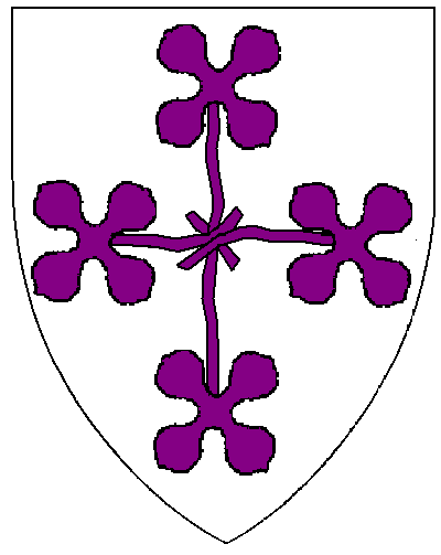 Her name and device (Argent, four quatrefoils saltirewise conjoined in cross, slips to center and crossed, purpure) both are registered with the SCA College of Arms.