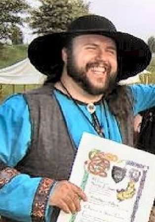He was the dean of the Meridian Bardic College for a year, and has authored several songs and stories such as" The Ghost with the Golden Helm" and his former household’s song "The Anthem of the Aseir". He also wrote plays for his former Comedia group, and has taught several classes including, Art History in the Scope of the SCA, Norse Myths and Legends, Norse Culture, Basic Middle Eastern Drumming, Pirates and Privateers, Celtic Ethnology, and courses in Gaelic and Arabic language. He was a member and sometimes ringleader of the Comida Del Arte group "Proschutto de Armorica" where he played one performance of IL Dottore.